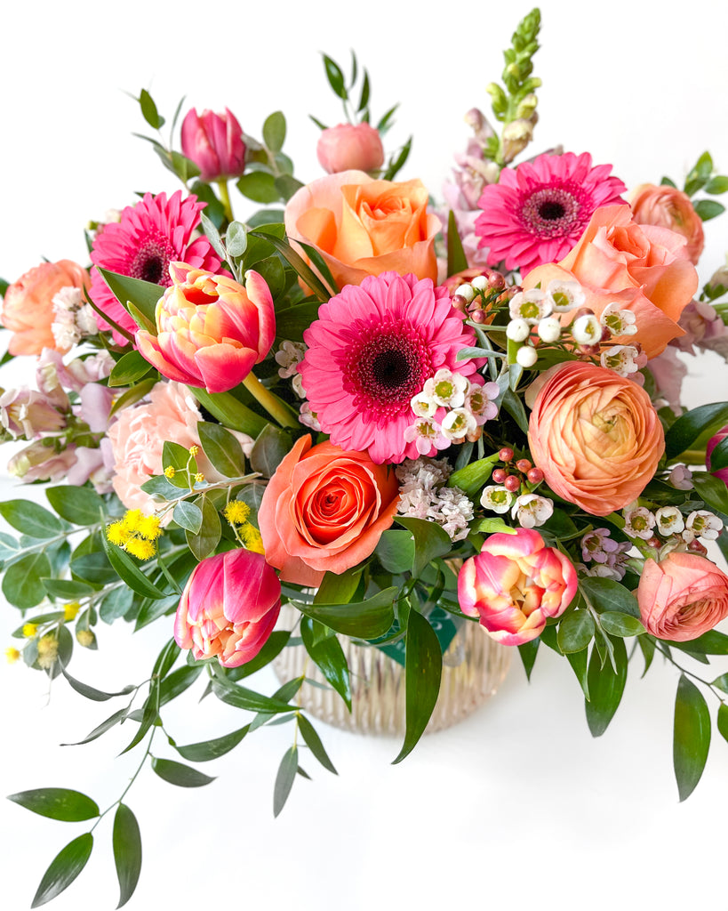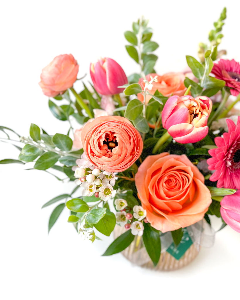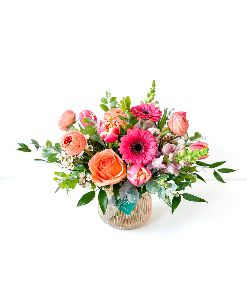 Our Gigil Mix is a flirty mix of doubled tulips, mini gerberas, roses, ranunculus and waxflower in pink, coral and peach — artfully arranged in a modern pink glass vase. Pair with something sweet for an extra memorable gift!